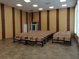 Площадь зала 119, 5 кв.м. Зал оборудован сценой, аккустикой, моторизированным экраном и проектором, рассчитан на 100 мест. Приспособлен для лиц с ОВЗ и инвалидов по слуху.